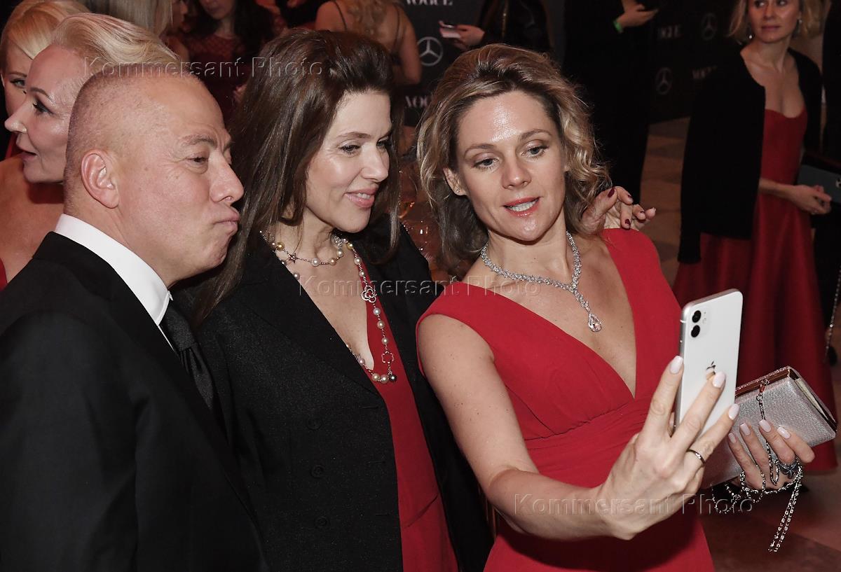 Гала-ужин Russia in Vogue в выставочном комплексе Исторического музея. Слева направо: телеведущая Сати Спивакова, главный редактор журнала Tatler Ариан Романовский и коллекционер, продюсер и предприниматель Валерия Роднянская на гала-ужине.