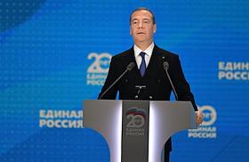 III этап съезда Всероссийской политической партии "Единая Россия" в Центральном выставочном комплексе "Экспоцентр". Председатель партии "Единая Россия", заместитель председателя Совета безопасности России Дмитрий Медведев во время выступления на съезде.
