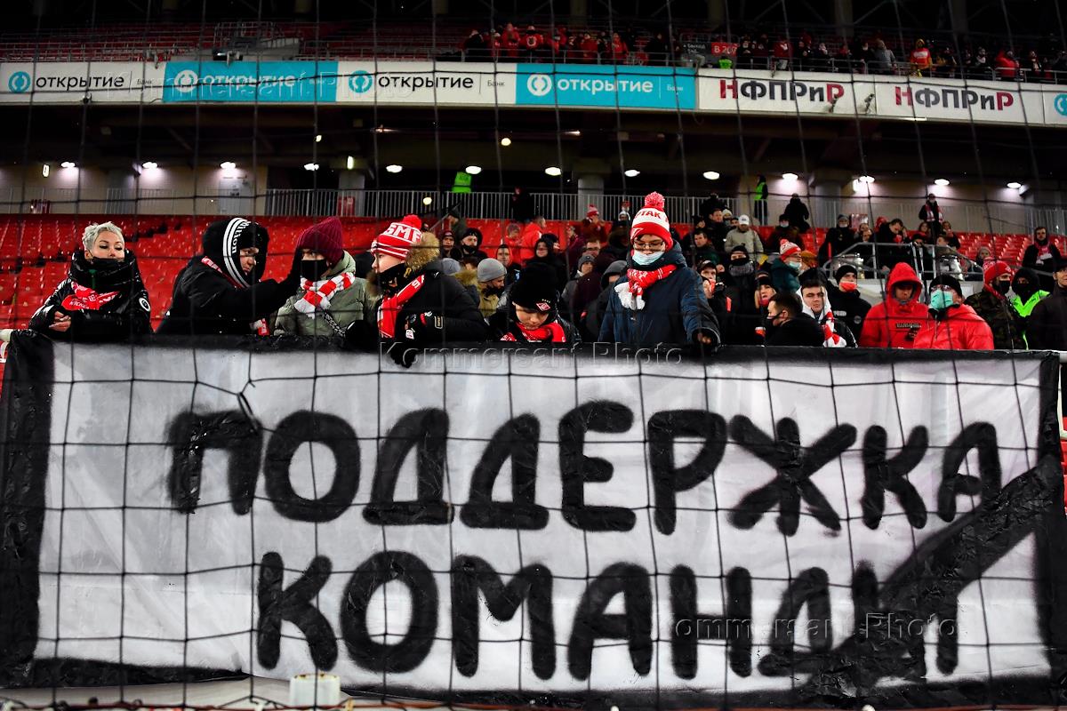 Российская Премьер-Лига (РПЛ). Тинькофф - Чемпионат России по футболу 2021/2022. 17-й тур. Матч между командами "Спартак" (Москва)- "Ахмат" (Грозный) на стадионе "Открытие банк Арена". Болельщики команды "Спартак" на трибуне во время матча.