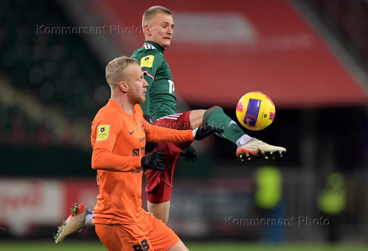 Российская Премьер-Лига (РПЛ). Тинькофф - Чемпионат России по футболу 2021/2022. 17-й тур. Матч между командами "Локомотив" (Москва)- "Урал" (Екатеренбург) на стадионе "РЖД Арена". Игрок команды "Урал" Кирилл Колесниченко (слева) во время матча.