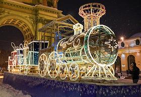 Жанровая фотография. Новогодняя инсталляция в форме новогоднего поезда у Нарвских триумфальных ворот на площади Стачек.