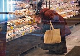 Жанровая фотография. Пожилая женщина выбирает кондитерские изделия в витрине магазина.