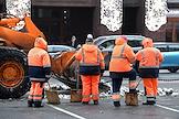 Жанровая фотография. Сотрудники коммунальной службы города во время очистки тротуара от снега у здания Государственной думы России на улице Охотный ряд. Спецсигнал синего цвета на крыше автомобиля депутат ГД России.
