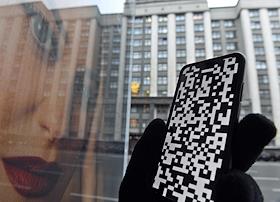 Жанровая фотография. Мобильный телефон с QR-кодом на экране на фоне здания Государственной думы России.