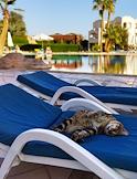 Туризм в Шарм-эль-Шейхе. Жанровая фотография. Кошка на лежаке у бассейна.
