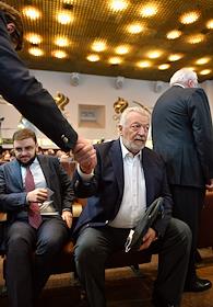 Ежегодное Олимпийское собрание Олимпийского комитета России (ОКР) в конференц-зале ОКР. Президент Федерации спортивной борьбы России Михаил Мамиашвили (слева) во время собрания.