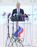 Ежегодное Олимпийское собрание Олимпийского комитета России (ОКР) в конференц-зале ОКР. Президент ОКР Станислав Поздняков во время пресс-подхода после окончания собрания.