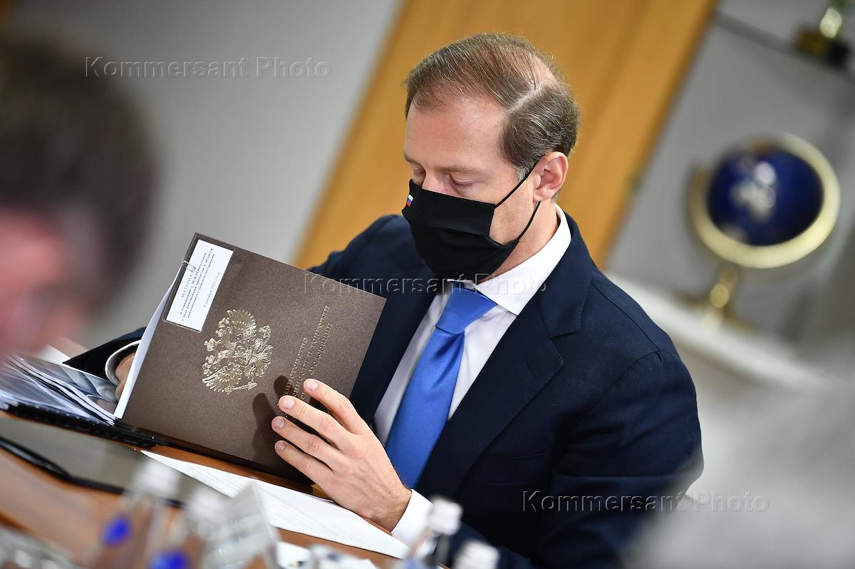 Рабочая поездка председателя правительства Михаила Мишустина в Пермь. Министр промышленности и торговли России Денис Мантуров перед началом совещания о реализации проектов в области авиационного двигателестроения во время посещения предприятия АО "ОДК Пермские моторы".