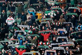 Лига Европы по футболу. Матч между командами "Легия" (Варшава, Польша) - "Спартак" (Москва, Россия) на стадионе имени маршала Юзефа Пилсудского. Болельщики команды "Легия" на трибуне во время матча.