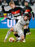 Лига Европы по футболу. Матч между командами "Легия" (Варшава, Польша) - "Спартак" (Москва, Россия) на стадионе имени маршала Юзефа Пилсудского. Игрок команды "Спартак" Георгий Джикия (слева) и игрок команды "Легия" Лирим Кастрати (справа) во время матча.