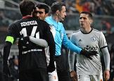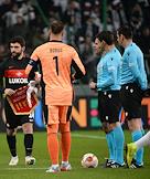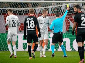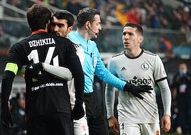 Лига Европы по футболу. Матч между командами "Легия" (Варшава, Польша) - "Спартак" (Москва, Россия) на стадионе имени маршала Юзефа Пилсудского. Игрок команды "Спартак" Георгий Джикия (слева) и главный судья Матей Юг (справа) во время матча.