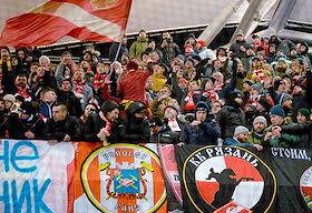 Лига Европы по футболу. Матч между командами "Легия" (Варшава, Польша) - "Спартак" (Москва, Россия) на стадионе имени маршала Юзефа Пилсудского. Болельщики команды "Спартак" на трибуне во время матча.