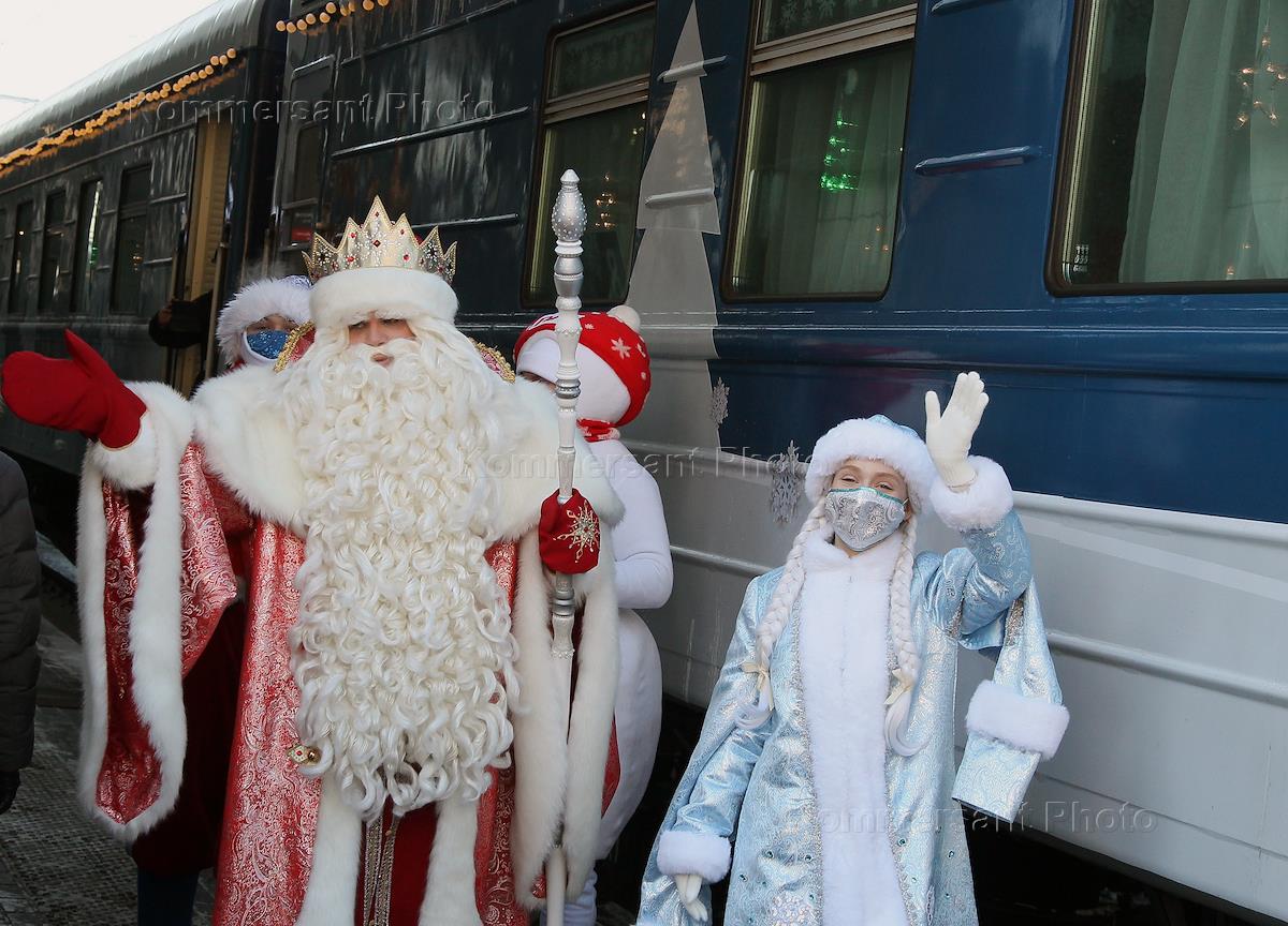 Церемония прибытия Деда Мороза на новогоднем поезде на Московский вокзал.