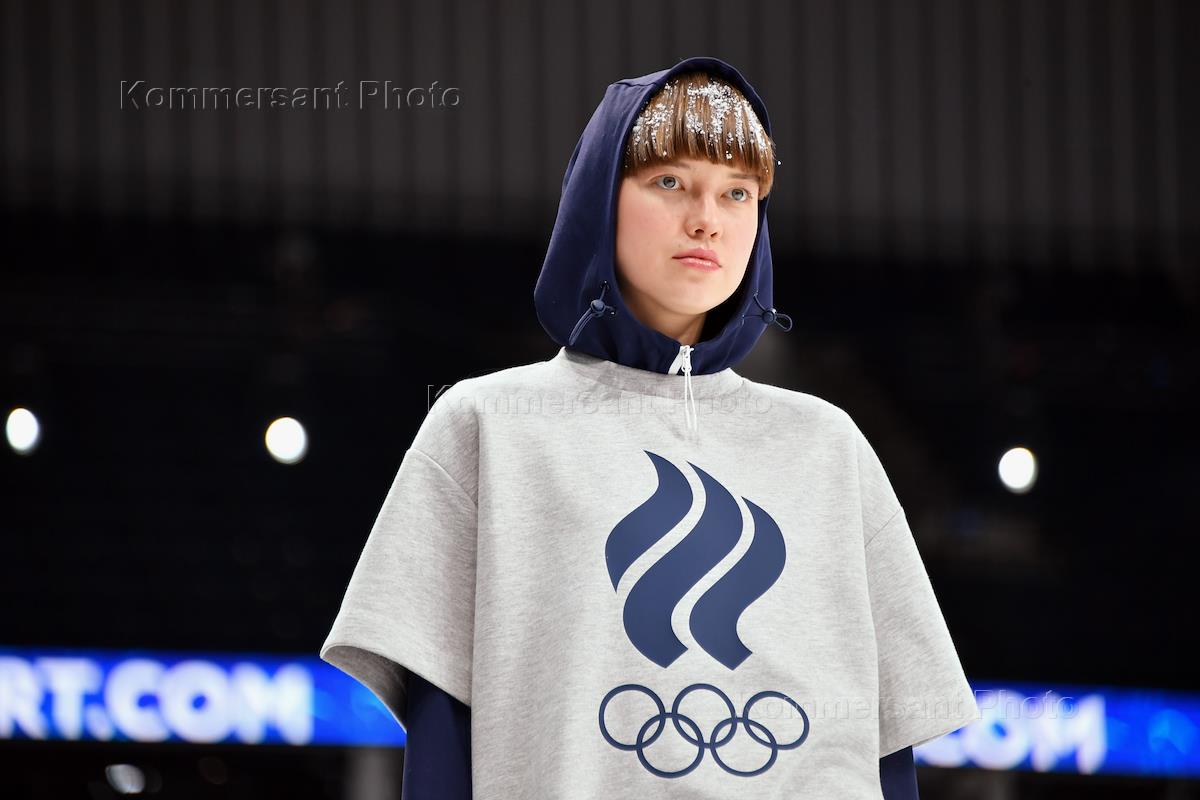 Презентация олимпийской коллекции ZASPORT для участников XXIV зимних Олимпийских игр 2022 года в Пекине на стадионе "ВТБ-Арена". Модель во время презентации.