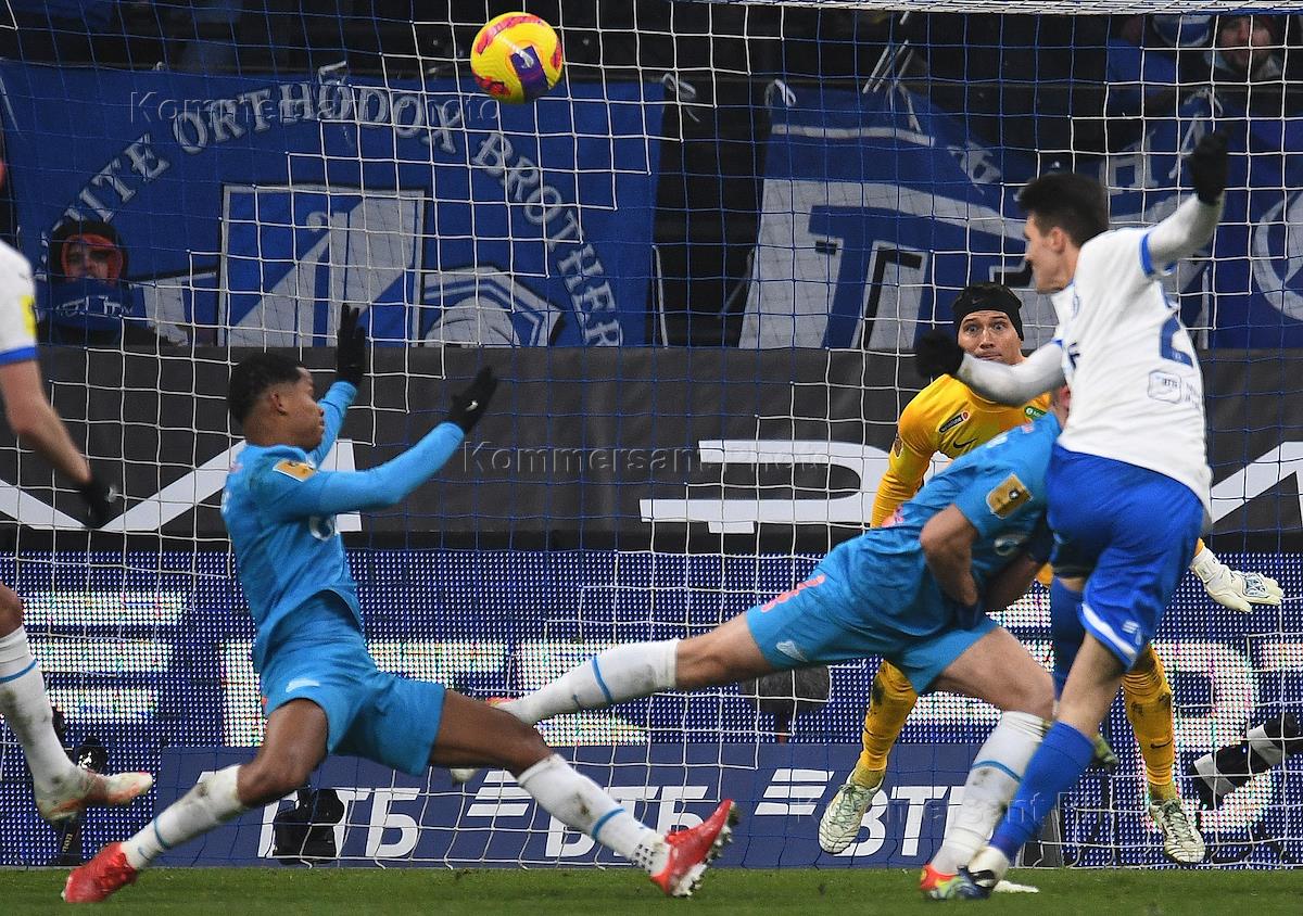 Российская Премьер-Лига (РПЛ). Тинькофф - Чемпионат России по футболу 2021/2022. 18-й тур. Матч между командами "Динамо" (Москва)- "Зенит" (Санкт-Петербург) на центральном стадионе "ВТБ Арена". Слева направо: игроки команды "Зенит" Далер Кузяев, Михаил Кержаков, Дмитрий Чистяков и игрок команды "Динамо" Никола Моро во время матча.