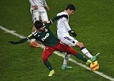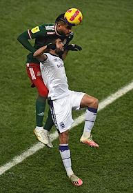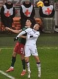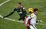 Российская Премьер-Лига (РПЛ). Тинькофф - Чемпионат России по футболу 2021/2022. 18-й тур. Матч между командами "Локомотив" (Москва)- "Уфа" (Уфа) на стадионе "РЖД Арена". Игрок команды "Локомотив" Наир Тикнизян (слева) и игрок команды "Уфа" Филип Мрзляк (справа) во время матча.