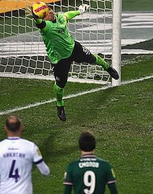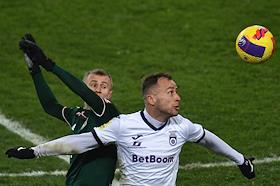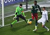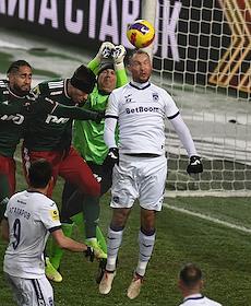 Российская Премьер-Лига (РПЛ). Тинькофф - Чемпионат России по футболу 2021/2022. 18-й тур. Матч между командами "Локомотив" (Москва)- "Уфа" (Уфа) на стадионе "РЖД Арена". Вратарь команды "Уфа" Александр Беленов (справа) во время матча.