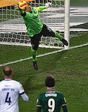 Российская Премьер-Лига (РПЛ). Тинькофф - Чемпионат России по футболу 2021/2022. 18-й тур. Матч между командами "Локомотив" (Москва)- "Уфа" (Уфа) на стадионе "РЖД Арена". Вратарь команды "Уфа" Александр Беленов во время матча.