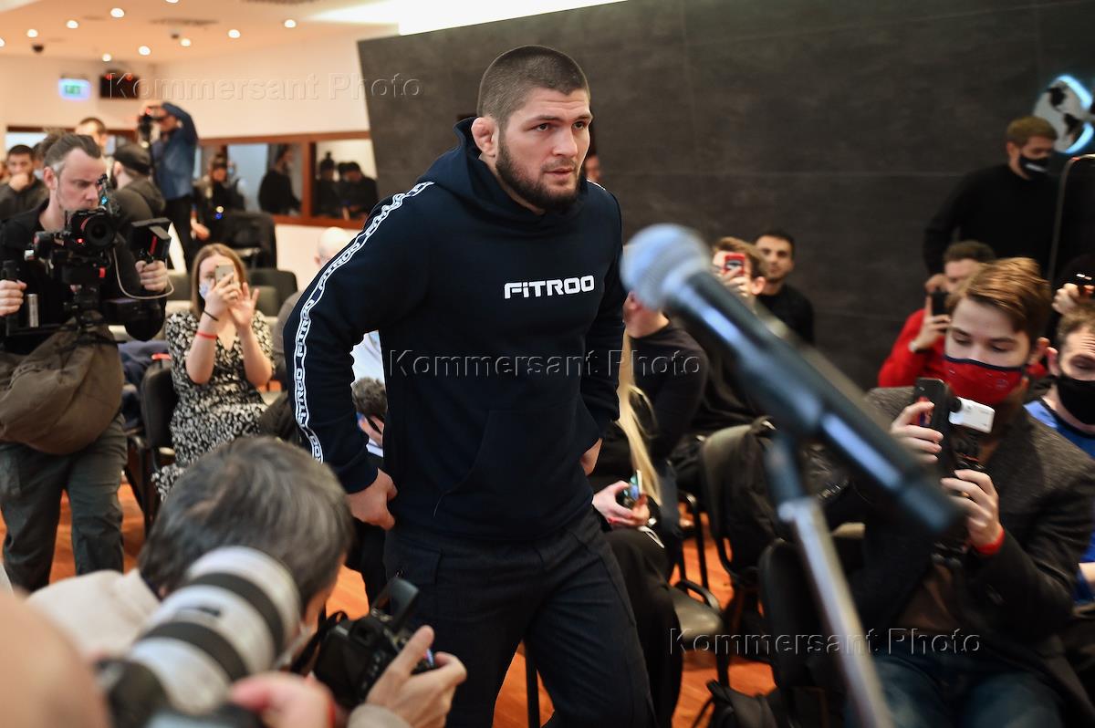 Пресс-конференция чемпиона UFC в легком весе Хабиба Нурмагомедова, посвященная его сотрудничеству с брендом FITROO и планам его команды на предстоящий год в Центре международной торговли.