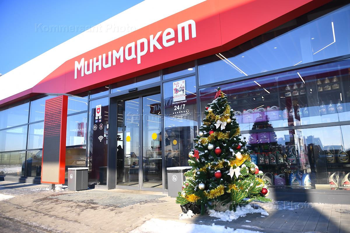 The work of the gas station (gas station) "LUKOIL". Genre photography. Christmas tree at the entrance to the petrol station minimarket.