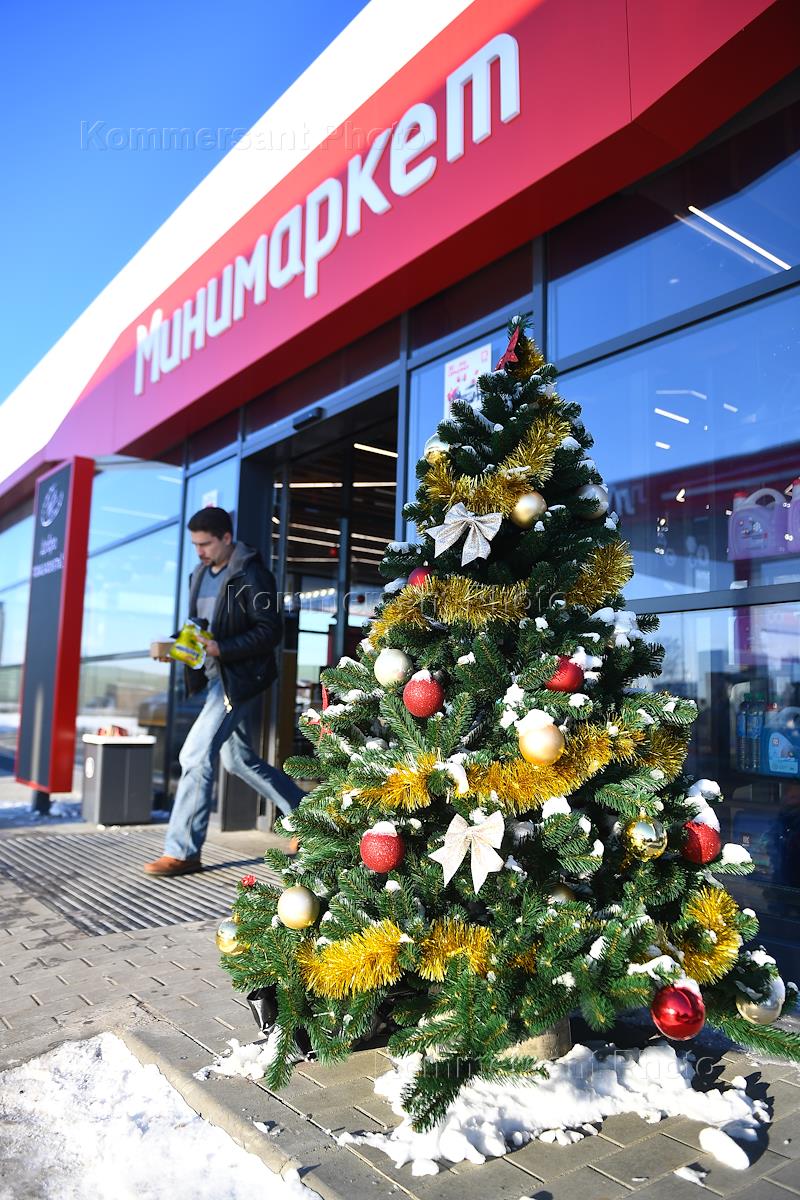 Gas station "Lukoil". Genre photography. New Year tree at the entrance to the minimarket at the ASZ.