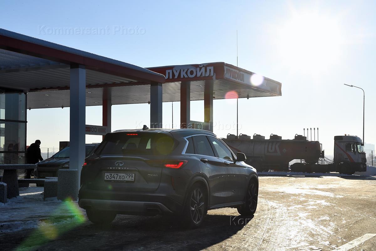 АЗС компании "ЛУКойл" на Дмитровском шоссе в деревне Капустино. Автомобиль на АЗС.