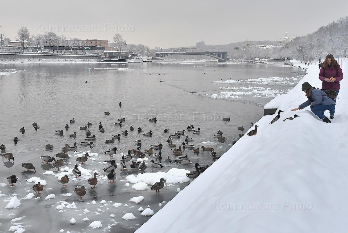 Виды Москвы после снегопада. Жанровая фотография. Девушки кормят уток на Андреевской набережной.