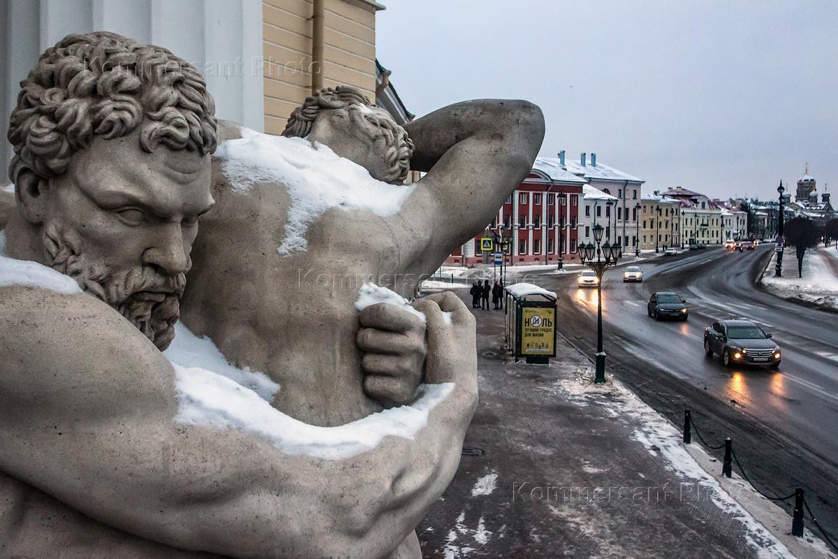 Views of St. Petersburg. Genre photography. Sculptures on the facade of the building.