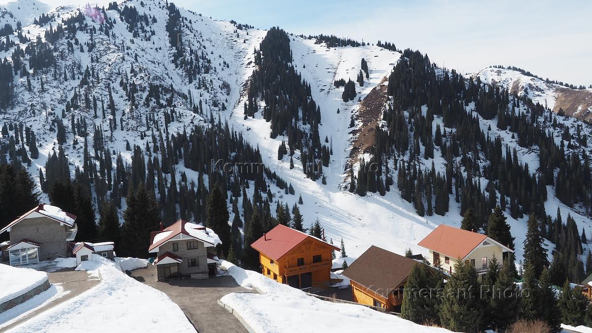 Горнолыжный курорт Чимбулак. Коттеджи и шале на фоне гор.