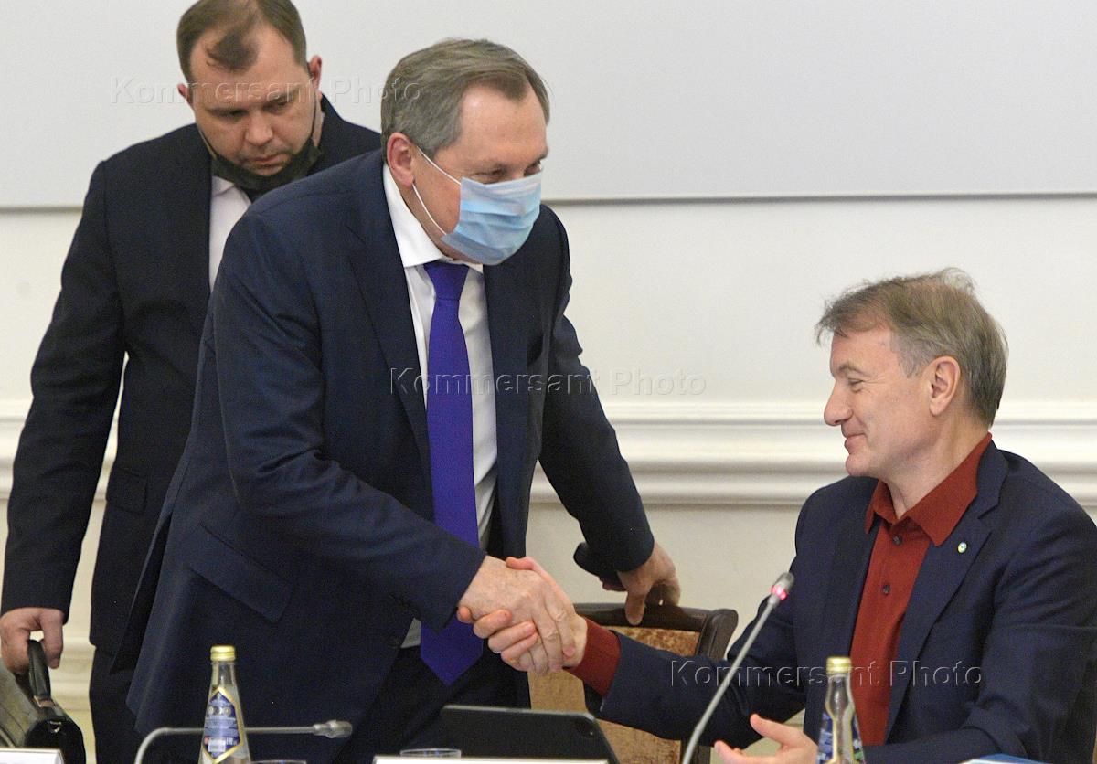 Заседание Общественного совета при Министерстве энергетики России в Общественной палате России. Первый заместитель секретаря Общественной палаты России Владислав Гриб (справа) и президент, председатель правления Сбербанка России Герман Греф (слева) во время заседания.