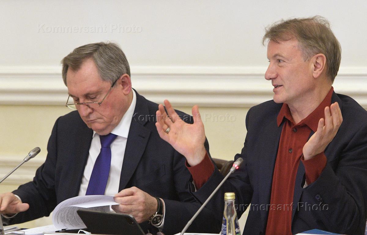 Meeting of the Public Council under the Ministry of Energy of Russia in the Public Chamber of Russia. First Deputy Secretary of the Public Chamber of Russia Vladislav Grib (right) and President and Chairman of the Board of Sberbank of Russia German Gref (left) during a meeting.