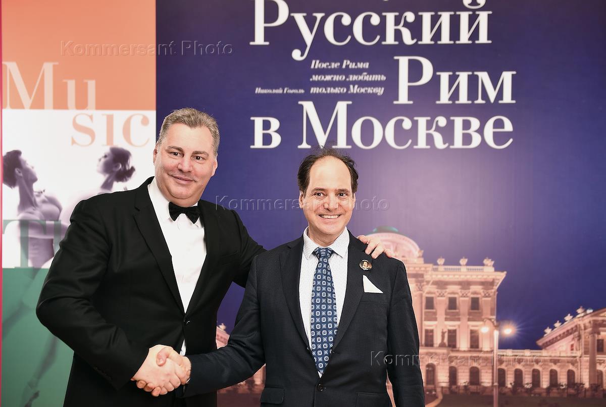Gala evening of the International Cultural Festival "Russian Rome" at the Pashkov House. Festival President Vladimir Torin (left) and composer, playwright, translator Julian Henry Lowenfeld (right) at the gala dinner.