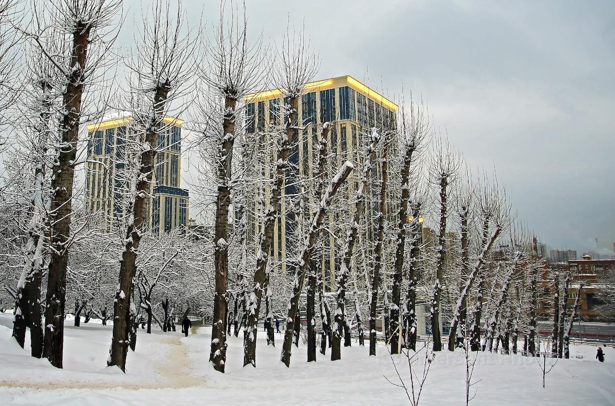 Views of Moscow. Genre photography. Park Pobedy on Poklonnaya Hill in the evening after a snowfall.
