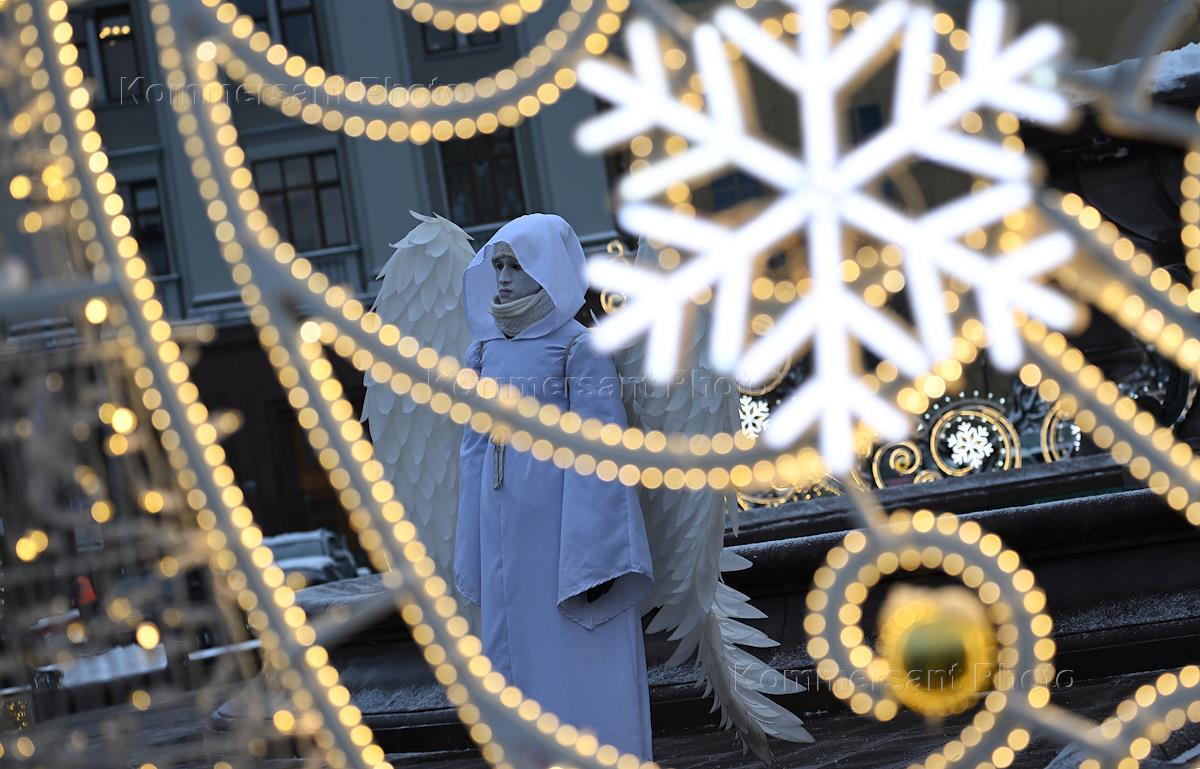 Виды Москвы. Жанровая фотография. Новогоднее убранство города. Десантники и актеры в костюмах ангелов на Никольской улице.