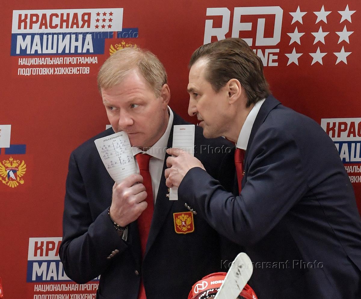 Hockey Channel One Cup. A match between the national teams of Russia and Canada at the CSKA Arena stadium. Russian national team head coach Alexei Zhamnov (left) and CSKA head coach Sergei Fedorov (right) during a match.