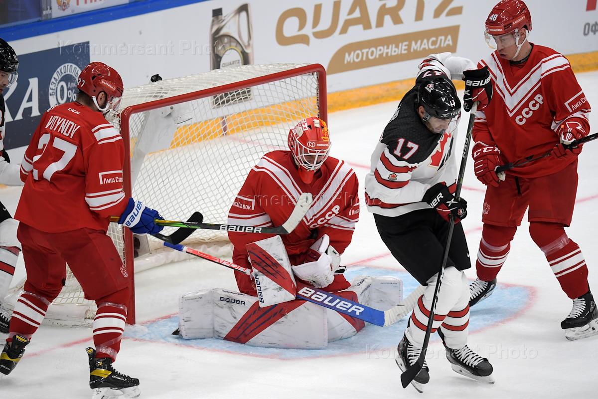 Hockey Channel One Cup. A match between the national teams of Russia and Canada at the CSKA Arena stadium. Canada's goalkeeper Justin Poggy, center, and Russia's Andrei Chibisov, right, during a match. Goal against the Canadian national team.