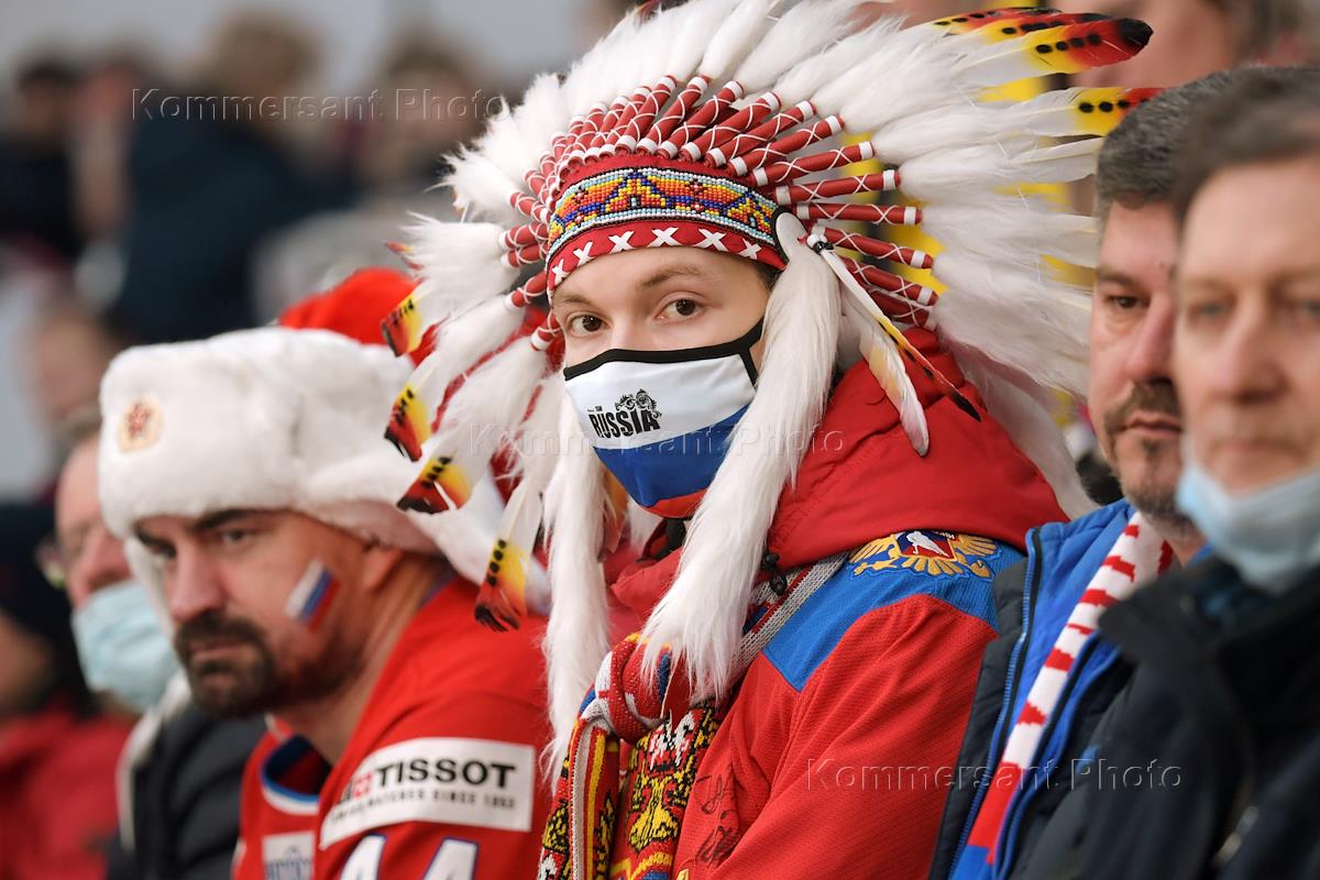 Hockey Channel One Cup. A match between the national teams of Russia and Canada at the CSKA Arena stadium. Fans of the Russian national team at the spectator tribune during the match.