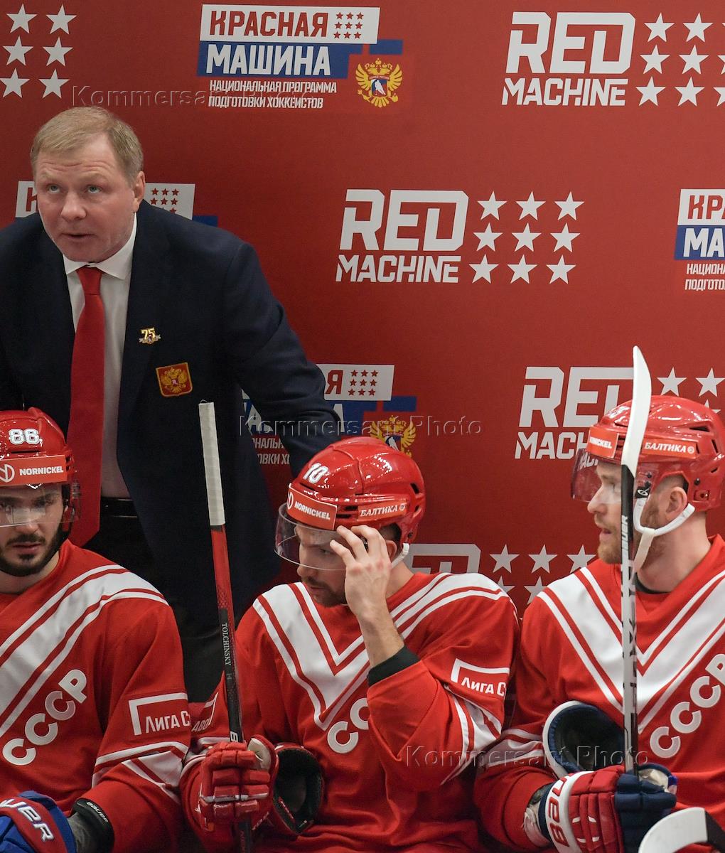 Ice Hockey Cup. A match between the national teams of Russia and Canada at the CSKA Arena stadium. Head coach of the Russian national team Alexei Zhamnov (center) and during the match.