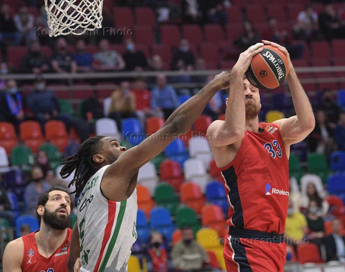Basketball Euroleague. A match between the teams CSKA (Moscow) - UNICS (Kazan) at the Megasport stadium. CSKA player Nikita Kurbanov (left) during a match.