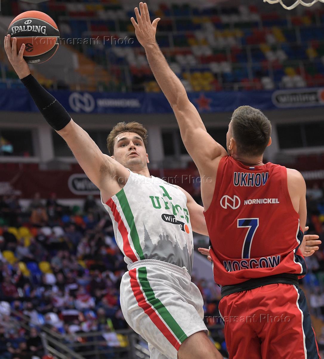 Basketball Euroleague. A match between the teams CSKA (Moscow) - UNICS (Kazan) at the Megasport stadium. CSKA player Ivan Ukhov (right) and UNICS player Mario Hezonja (left) during a match.