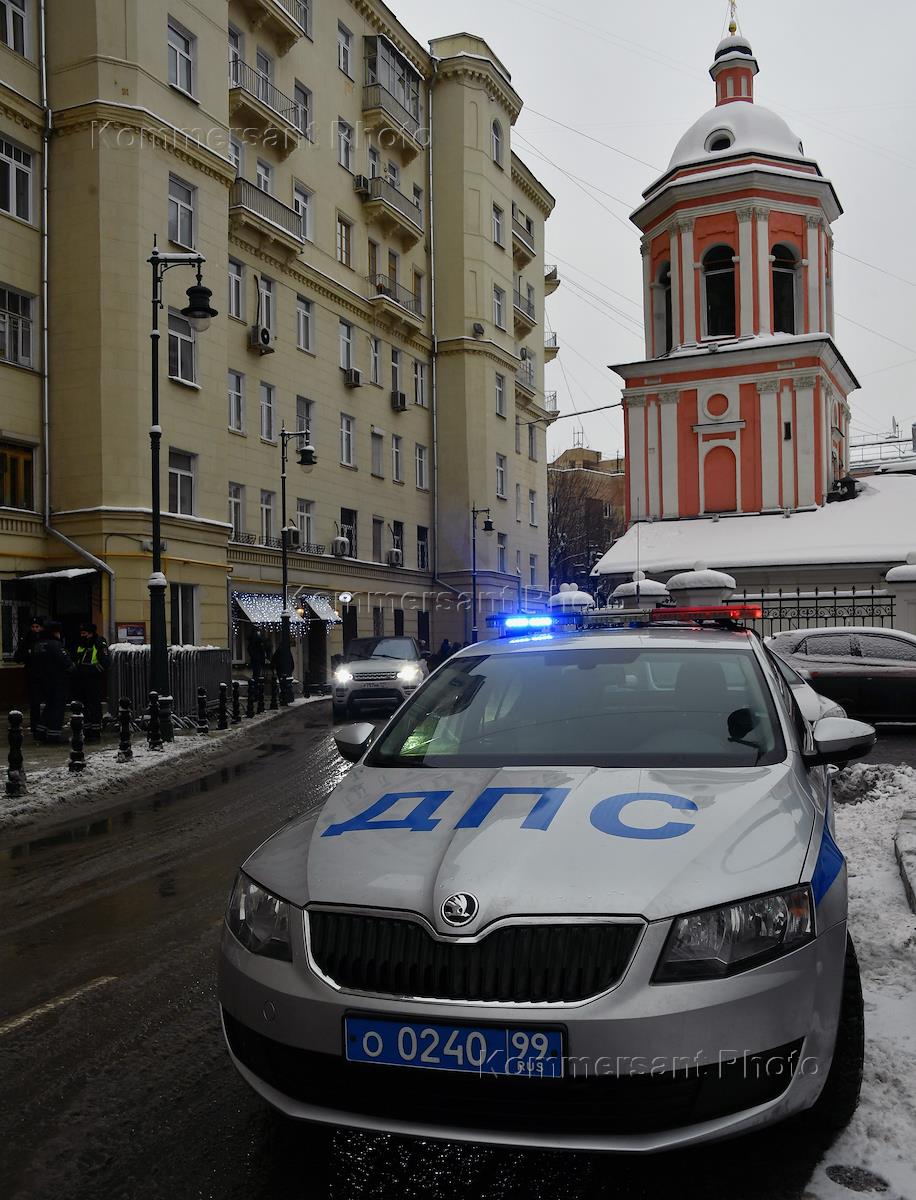 Чин отпевания и церемония прощания с режиссером Сергеем Соловьевым в церкви Иоанна Богослова на Бронной. Жанровая фотография. Автомобиль ДПС возле здания церкви.