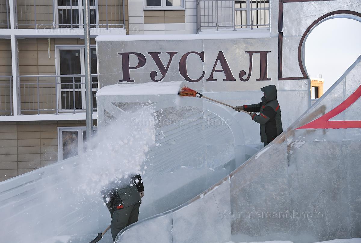 Виды Тайшета. Жанровая фотография. Ледяные горки и скульптуры перед административным зданием Тайшетского алюминиевого завода компании "Русал" (ООО "Русал Тайшет").