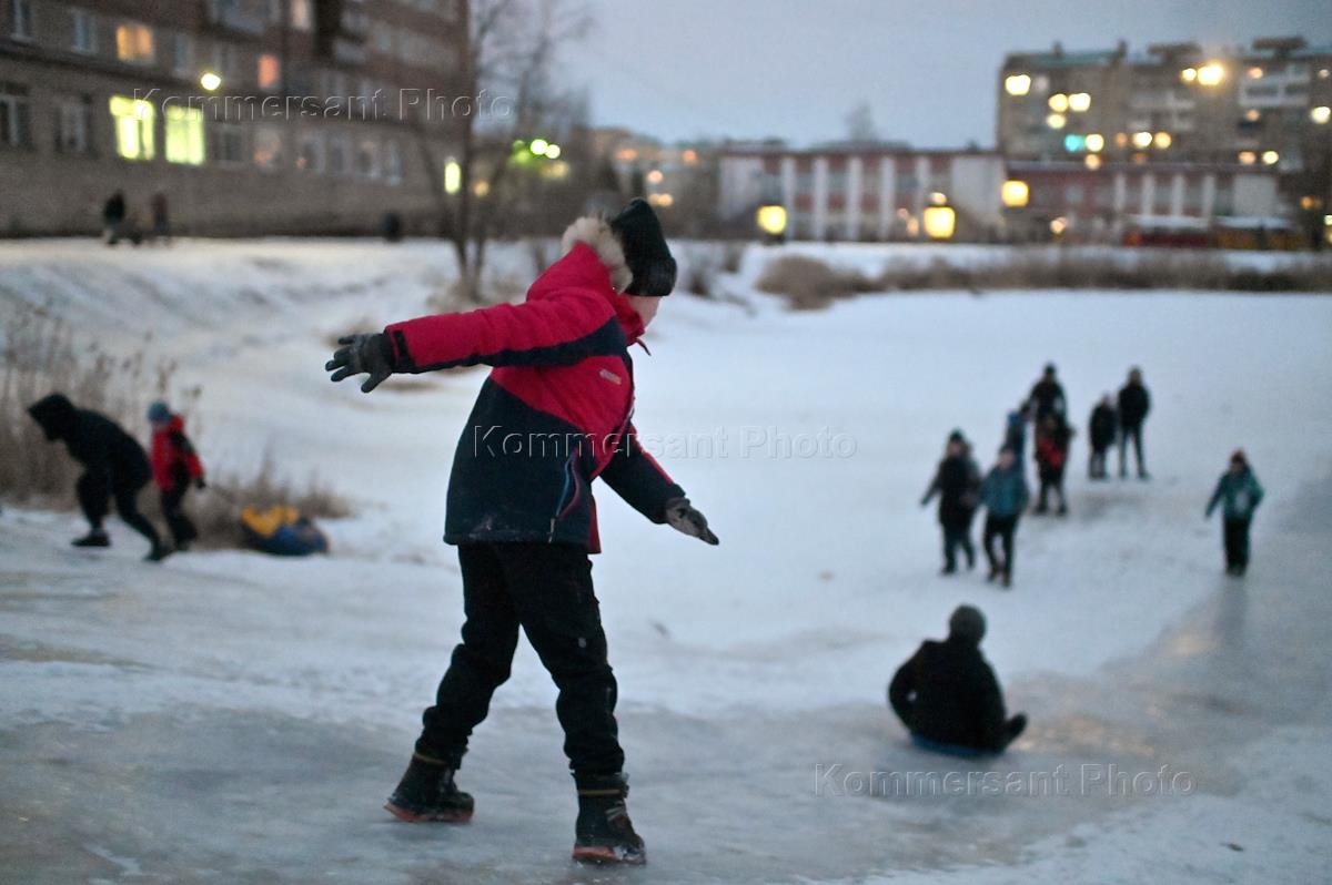 Views of Omsk. Genre photography. Children and adults alike ride on an ice slide.