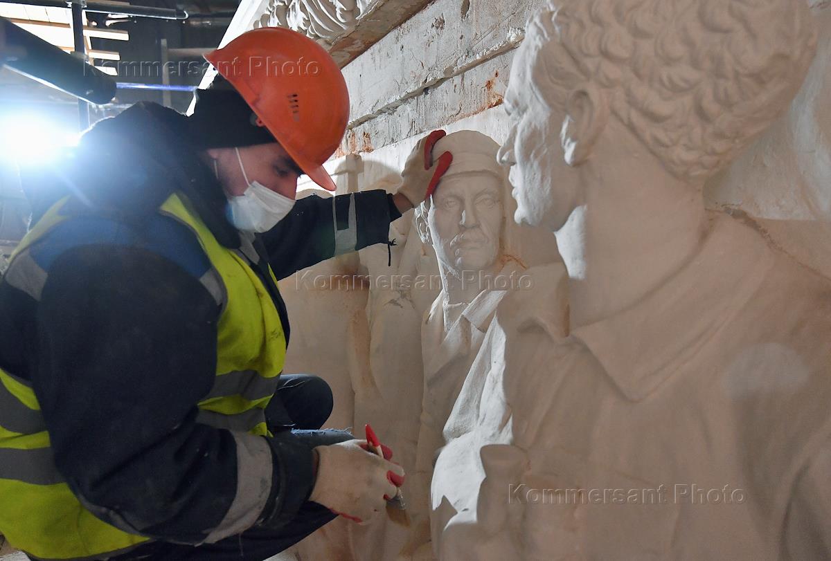 Реставрация павильона №15 "Радиоэлектроника и связь" на ВДНХ. Жанровая фотография. Художники во время восстановления барельефов.