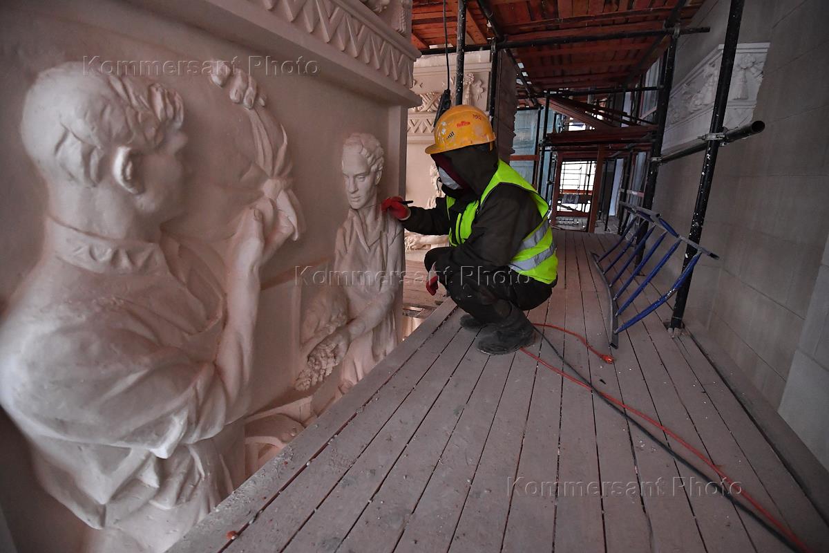 Restoration of pavilion No. 15 "Electronics and Communications" at VDNH. Genre photography. Artists during the restoration of stucco in the building.