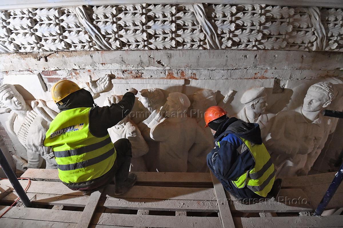 Реставрация павильона №15 "Радиоэлектроника и связь" на ВДНХ. Жанровая фотография. Художники во время восстановления лепнины в здании.