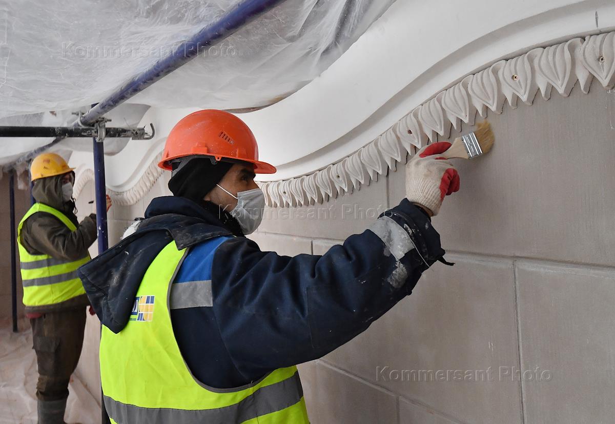 Реставрация павильона №15 "Радиоэлектроника и связь" на ВДНХ. Жанровая фотография. Художники во время восстановления лепнины в здании.