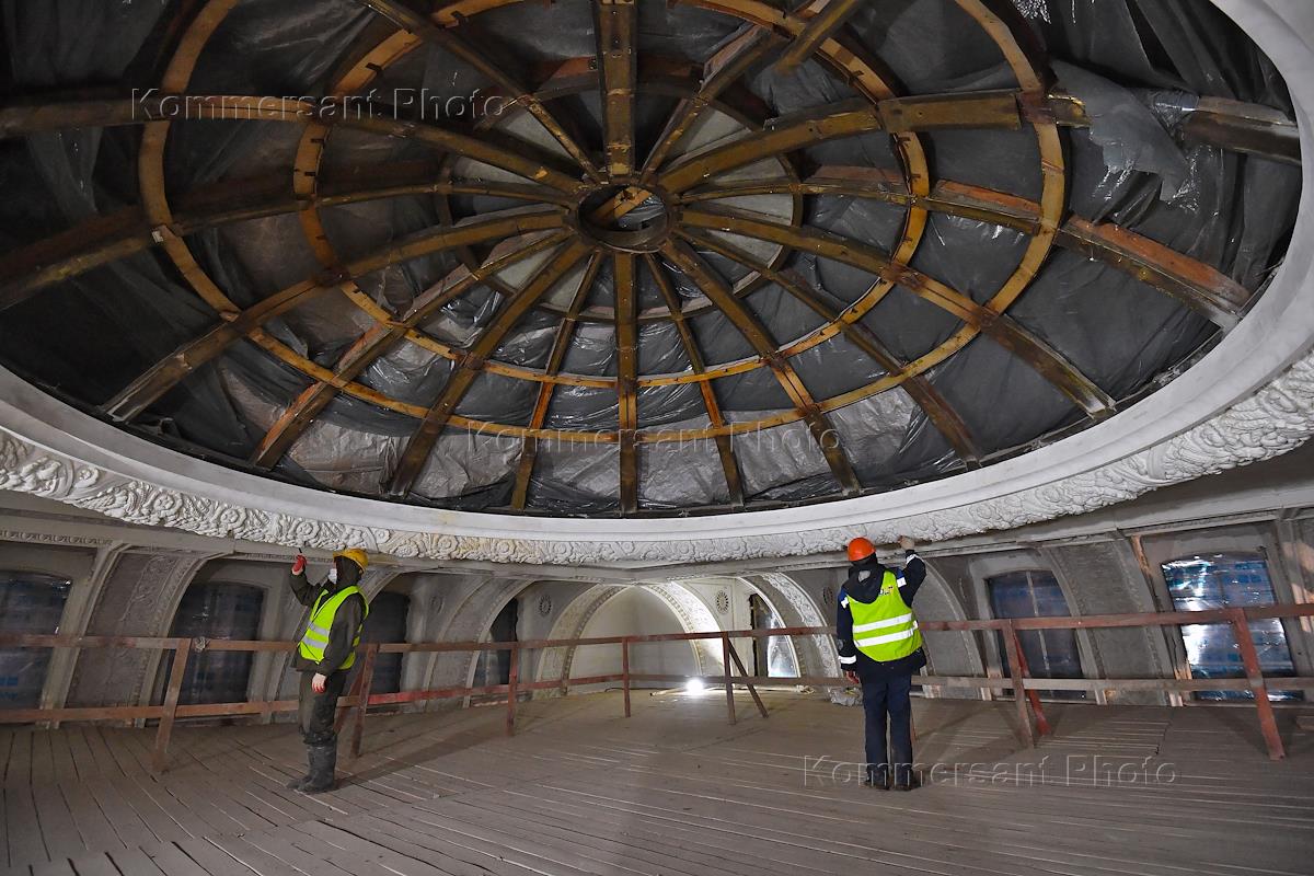 Реставрация павильона №15 "Радиоэлектроника и связь" на территории ВДНХ. Жанровая фотография. Рабочие во время восстановления лепнины купола здания павильона.