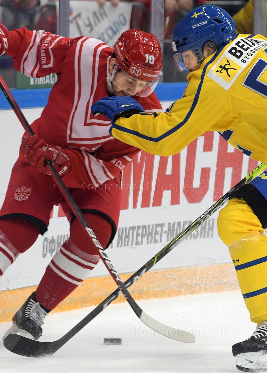 Кубок Первого канала по хоккею. Матч между сборными командами Швеции и России на стадионе "ЦСКА-Арена". Игрок сборной России Сергей Толчинский (слева) во время матча.