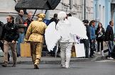 Views of St. Petersburg. Genre photography. A street performer dressed as a white angel after a performance.